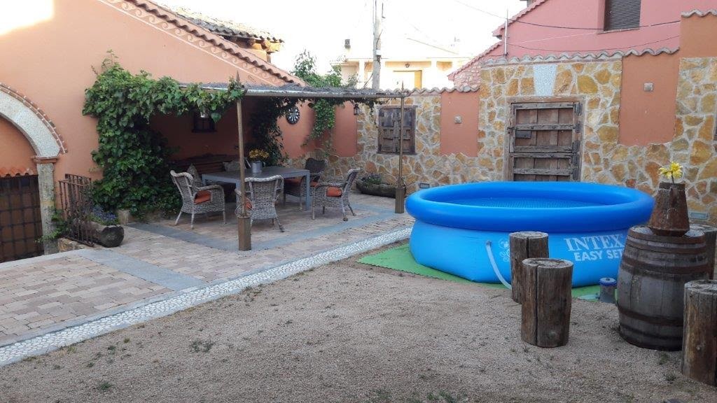 En la parte exterior de la casa rural está, por un lado un patio delantero con una mesa redonda y 4 sillas. En la fachada trasera de la casa hay otro patio. En este hay un porche, una mesa con 4 butacas de mimbre y un banco corrido; y al lado de la zona techada está la barbacoa de leña construida en piedra. Este patio trasero está decorado con un barril que hace de mesa y alrededor tiene 4 troncos que hacen la función de sillas.