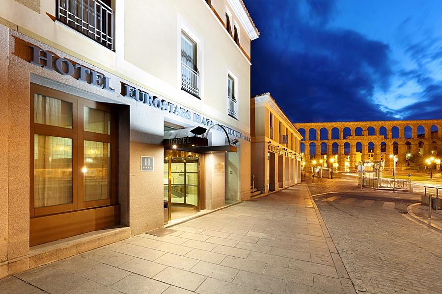Enclavado a los pies del acueducto de Segovia, uno de los monumentos más reconocidos de España y Europa, el Hotel Eurostars Plaza Acueducto respira historia y cultura por todos sus poros. La mayor parte de las habitaciones tienen vista directa hacia la gran obra de ingeniería romana. También desde la gran terraza del hotel se disfruta de unas vistas panorámicas sobre el acueducto y buena parte del casco viejo de Segovia: la terraza constituye un ambiente inigualable donde celebrar presentaciones, cocktails o coffees de empresa. Dicen los entendidos que no existe otro edificio en la ciudad con mejor ubicación para contemplar la gran obra maestra que dejaron los romanos en España. ¿Sabe cuál es el gran secreto del acueducto? ¿Por qué se ha mantenido intacto durante dos mil años? Porque continuó, hasta el siglo XX, cumpliendo su función de llevar agua a la ciudad. Porque era útil. Y ese es el espíritu en el que se inspira el Eurostars Plaza Acueducto. Ser útil a nuestros huéspedes, ofreciéndoles el mejor servicio y confort en el mismísimo centro de Segovia .El hotel dispone de tres modernos salones de reuniones (Alcázar, Trajano y Guadarrama), internet corner, WiFi gratuito en todo el recinto, parking cubierto y fácil acceso peatonal a los principales focos culturales de la ciudad, como el Teatro Juan Bravo o la sala de la Obra Social Caja Segovia. El Eurostars Plaza Acueducto fue construido en 2006, con un diseño arquitectónico totalmente adaptado a tan singular entorno.